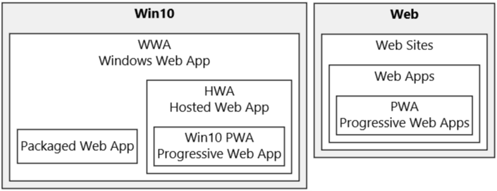 A subset of web apps are progressive web apps. Progressive web apps are web apps that have a W3C app manifest and a service worker. Various OSes are beginning to support PWAs as first class apps on their platform. This is true for Win10 as well in which PWAs are run as a WWA.